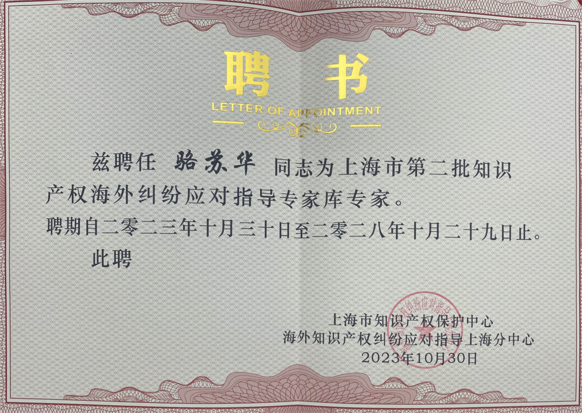 集佳上海分所合伙人骆苏华博士、合伙人李擘律师获聘成为上海市知识产权保护中心第二批海外维权援助专家(上海市第二批知识产权海外纠纷应对指导专家库专家)暨虹桥国际中央商务区海外维权援助基地首批专家。